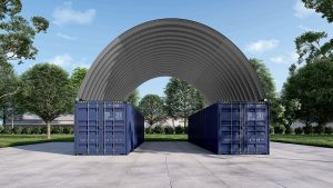 Stacking these Shipping Containers on top of each other 2 or 3 high and installing a Container roof between two shipping containers provides ample Commercial space for storage, heavy machinery, job-site coverage and even office space. Whether it is for a standard container roof kit or custom large Industrial building kit, Curvco offers a cost-effective solution.